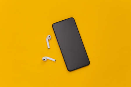 Modern smartphone with wireless earphones on yellow background. top view. flat lay