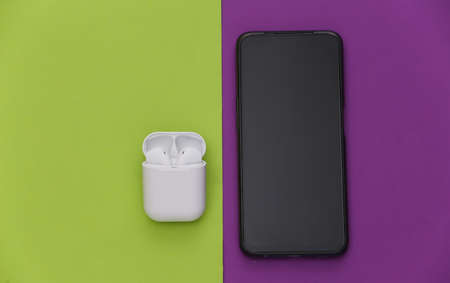 Modern smartphone and wireless earphones with charging case on purple green background. top view. flat lay