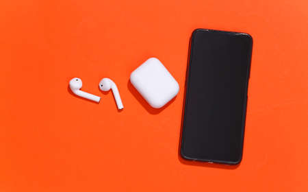 Smartphone and wireless headphones or earbuds with charging case on bright orange background. top view