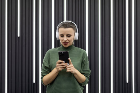 adult caucasian woman with a short haircut in headphones stands with a phone on the background of a backlit wall
