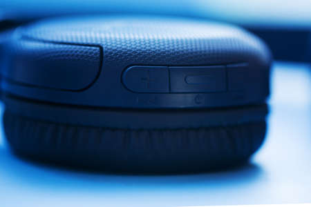 Wireless Headphones with buttons on blue background. Closeup view. Music concept. Shallow depth of field image