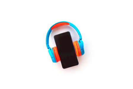 Smartphone with Blank Screen and Earphones Isolated on white background. Top view of Music and technology concept. Flat lay smartphone with headphone. copy space for creative design text and word.