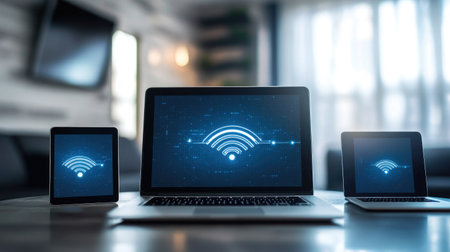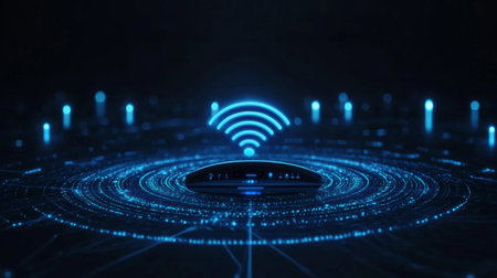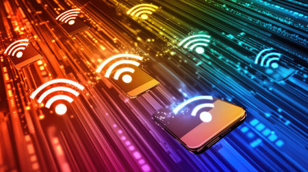 Wifi mobile communication and wireless network technology symbol digital concept. Network, cyber technology and computer background abstract 3d illustration.