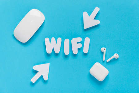 Wi-Fi router, smartphone and laptop on a wooden table. top view