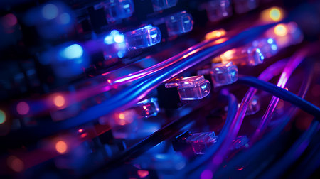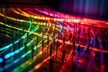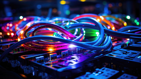 A vivid close-up of colorful electronic cables and connectors on a circuit board. The intricate details and vibrant lights create a stunning visual representation of technology.