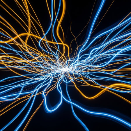This vibrant abstract close-up features glowing blue neon tubes intertwined in a chaotic yet captivating design, perfect for tech and energy themes.
