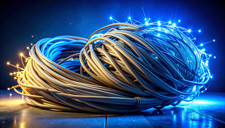A tangled coil of cables glows with the pulse of information, illuminated by blue and gold lights.