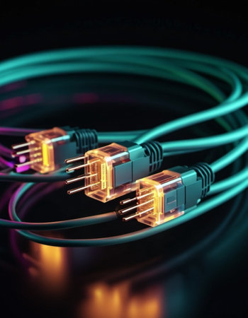 Fiber Optic cables connected to an optic ports. 3d rendering generative ai