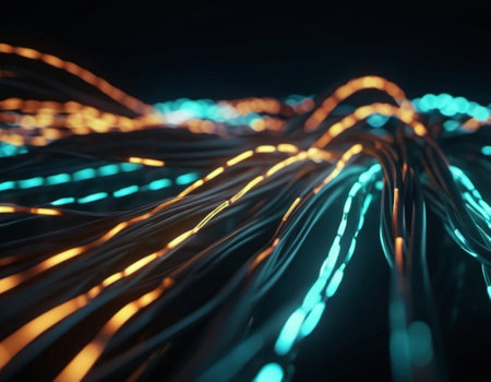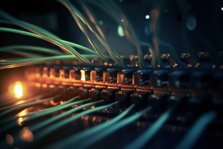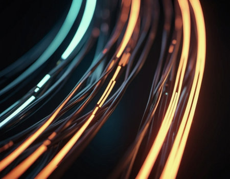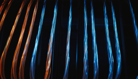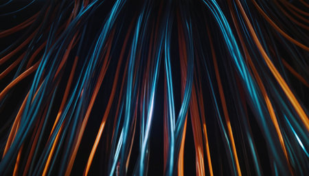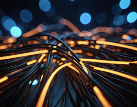 Blue and orange glowing wires twisting and intertwining against dark background with bokeh lights. Black cables and connectors with glowing lights and circuits connect to form a network. AI generated.