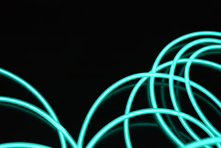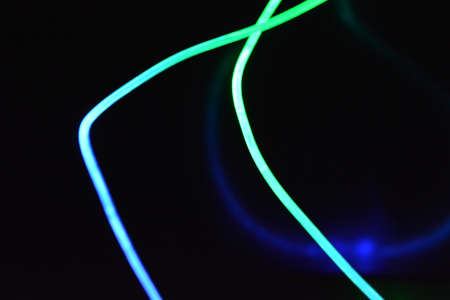 Green and blue light wire, a light guide wire with different light transmission, light spectrum, and light effects located in a chaotic state with light reflection on a black glossy background.