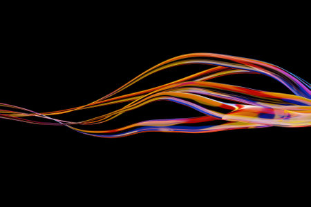 Dynamic composition presents an abstract arrangement of vibrant, curving lines against a dark backdrop. The lines display a spectrum of bright colors. This visual effect might be suitable for various design applications, including backgrounds for presentations or decorative elements in advertising.