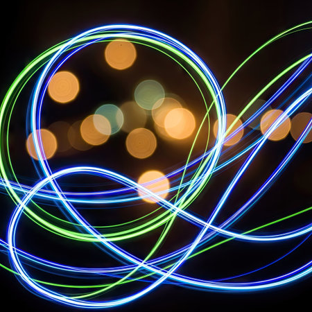 This image features abstract light trails in blue and green, swirling against a blurred background of warm, orange circles. The composition uses long exposure, creating dynamic curves and lines. The aesthetic suggests a digital, artistic style suitable for creative projects and visual content.