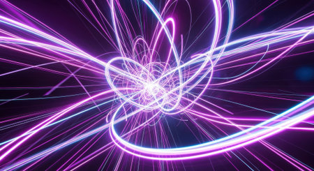 Dynamic abstract image featuring swirling neon purple energy lines radiating from a bright central glow on a deep purple backdrop.