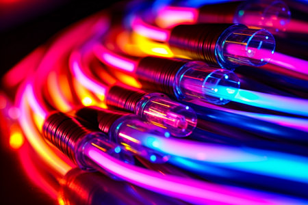 colored electric cables and led. optical fiber, intense colors, background for technology image and new business trends created with Generative AI technology