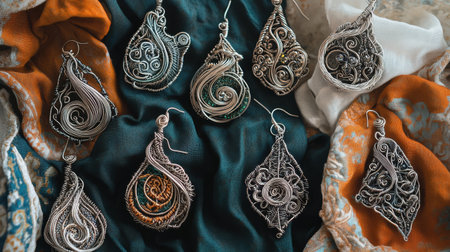 A stunning collection of intricately designed silver earrings, meticulously arranged on a vibrant fabric background, showcasing unique craftsmanship and elegance.