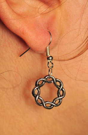 Detailed shot of a modelaes ear with unique, handcrafted silver earrings, showcasing their artistic design and intricate details