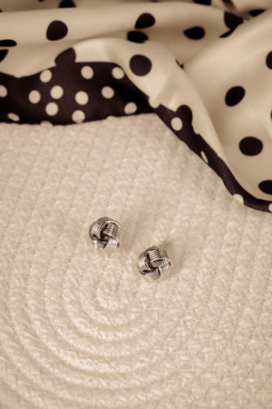 A pair of elegant silver earrings elegantly placed on a smooth satin material background