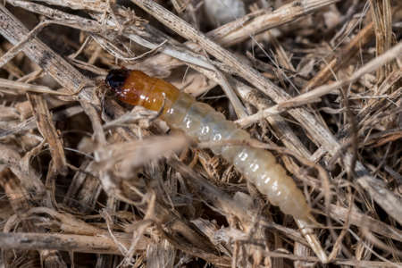 Close up of larva of the chafer beetle (lat. Melolontha) in brown mold.