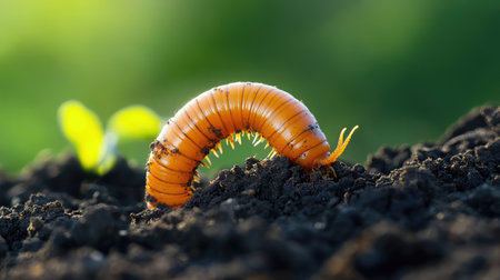 Close up macro photograph capturing a symphylan, a small myriapod arthropod, navigating the textured terrain of fertile soil, revealing its delicate features