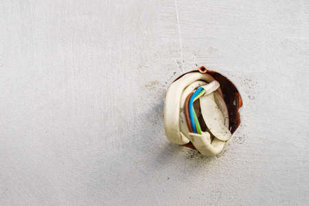 Colorful cables wires sticking out of grey concrete wall. Details during house renovations.