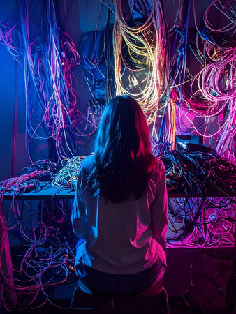 Person Facing Chaotic Network of Cables in Vibrant Lighting