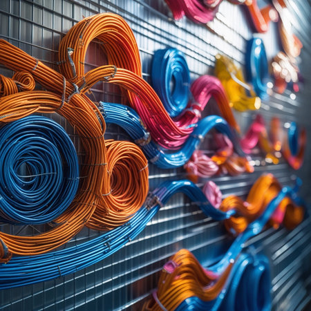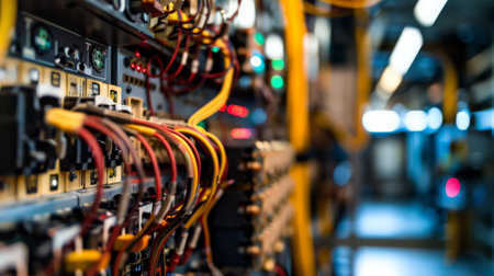 A detailed close-up view of colorful electrical wires and cables, emphasizing the intricate connections and vibrant colors in a technology setting.