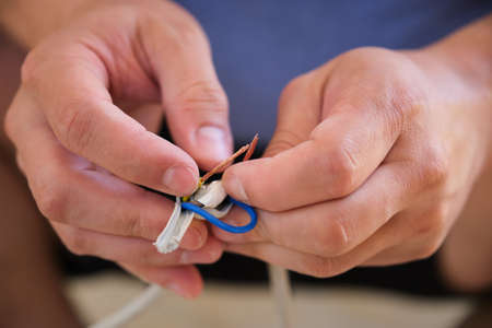 Close up of a young caucasian man hands repairing or splicing wires.