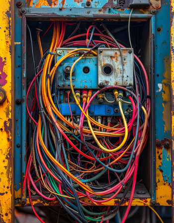A glimpse into a forgotten system, where a chaotic explosion of multicolored wires reveals the complex and hazardous heart of old industrial machinery.