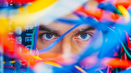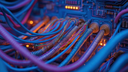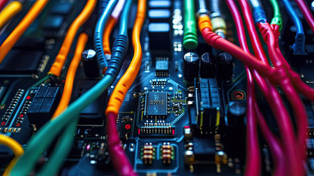 A vivid close-up of colorful electronic cables and connectors on a circuit board. The intricate details and vibrant lights create a stunning visual representation of technology.