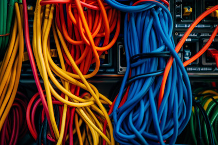 Colorful tangled cables and wires in a server closeup technology concept