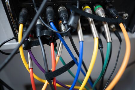 Various colored sound cables connected.Music and sound equipment concept