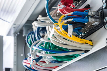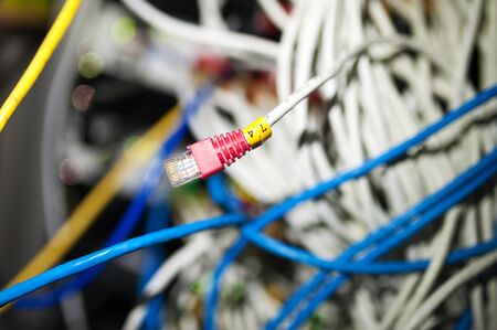 Colorful network cables close up connected to server equipment tech concept