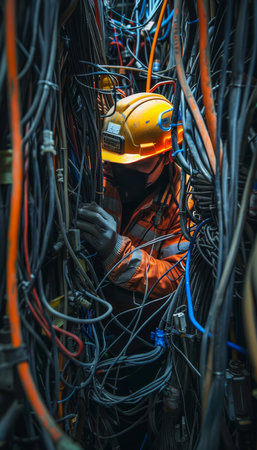 Skilled electrician navigating complex wiring task among tangled cables and equipment