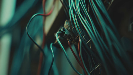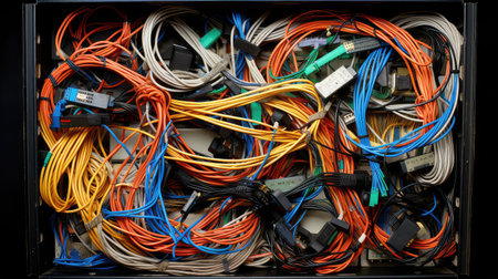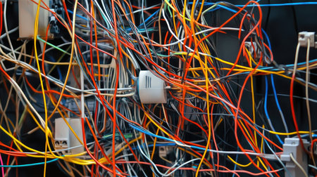 A jumble of colorful electrical wires sprawls across a workspace, showing various hues like red, blue, and yellow. The chaos highlights the intricacies of technology.
