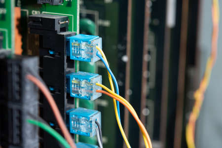 Old analog telephone switchboard system connection panel with wire fixed-line in old cabinet with copy space.