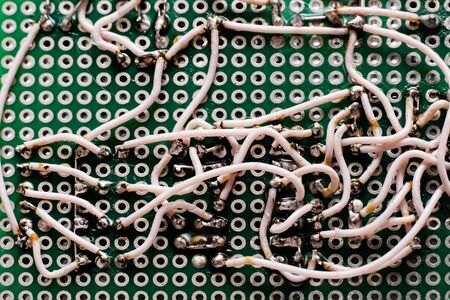 White wires on a green circuit board close up