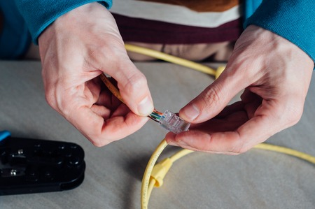 Specialist connect a network cable with RJ45 sockets, process of laying the local network
