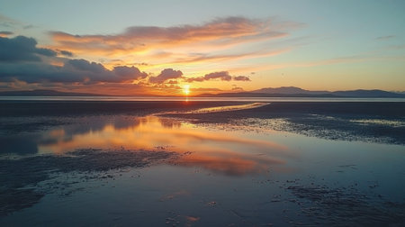 A breathtaking sunset casts warm hues across the sky, reflecting perfectly on the tranquil water of the beach. The soft clouds enhance the scene's beauty, creating a peaceful atmosphere perfect for relaxation and contemplation.