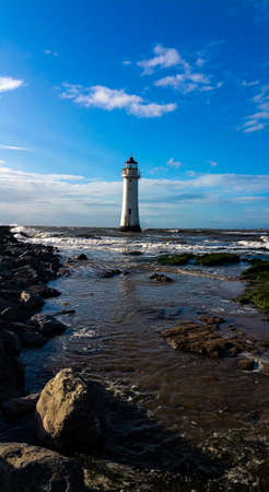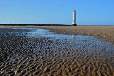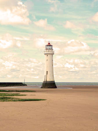 White old lighthouse on the Irish Sea shore at New Brighton Liverpool UK, with wet sand in the foreground and cloudy sky in the background