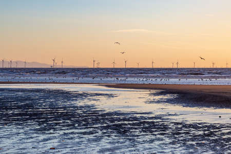 Looking out to sea at sunset from the Merseyside coast, with a view of an off shore windfarm and the hills of North Wales in the distance
