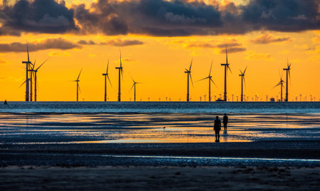 Wind turbines generate green energy near Liverpool.
