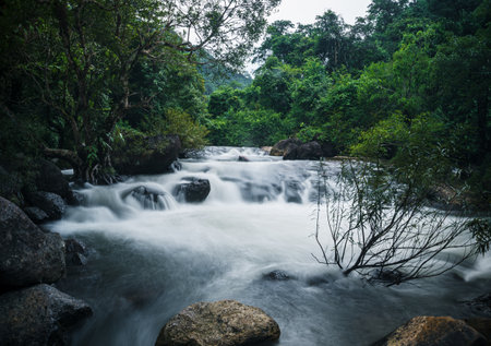 Experience the serene beauty of Nang Rong Waterfall in Nakhon Nayok, Thailand. The tranquil flow of water amidst lush greenery creates a perfect escape into nature.