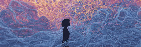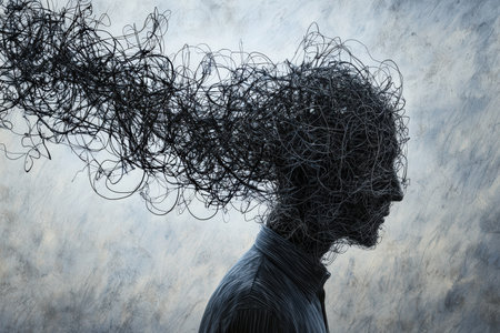 A silhouette of a person stands still as swirling strands of tangled thoughts flow outward, embodying creativity and confusion.