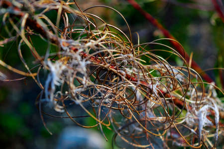 Extreme macro of polyester stable fiber on green background. Selective focus, shallow depth of field. Abstract dreamy background