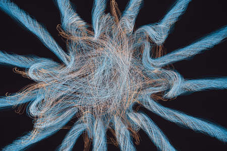 Spreading blue fiber wires in space. Camera movement for wires. The concept of distribution and transmission of information in the digital world. 3d illustration