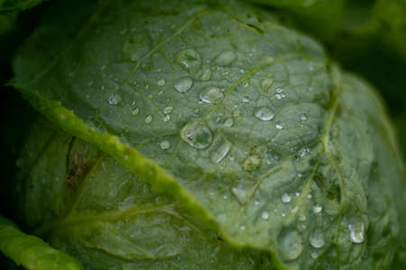 Large group of fresh green cabbage in an organic garden, with small water drops in a rainy summer day, beautiful outdoor monochrome background photographed with soft focus