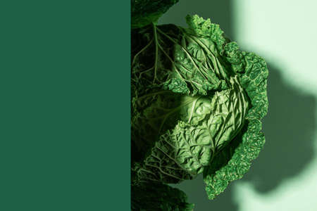 Creative shot of savoy cabbage on light green background with hard light. healthy vegan food. top view