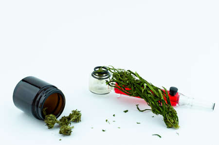 Black glass medical vial of cannabis buds inside and glass smocking pipe on the background. Medical cannabis concept