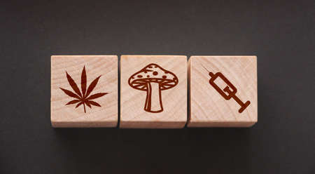 Drugs icons on natural wooden cubes. Cannabis leaf, mushroom and syringe on wooden blocks. Drug Abuse addiction prevention and awareness, healthcare medical rehab concept.
