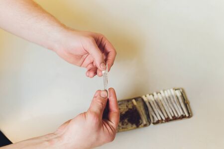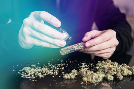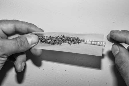 Addict hands making marijuana jamb closeup.